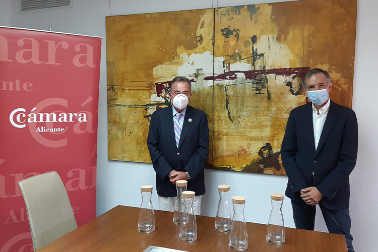 Aguas de Alicante prosigue con la campaña de concienciación medioambiental iniciada hace unos meses para la promoción del consumo de agua del grifo entre diferentes entidades, públicas y privadas. Así, Francisco Bartual, director general de la compañía, se ha reunido esta mañana con Juan Riera, presidente de la Cámara de Comercio de Alicante, para hacer entrega de jarras de vidrio que serán utilizadas en los actos que dicha corporación acoja.