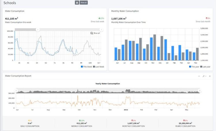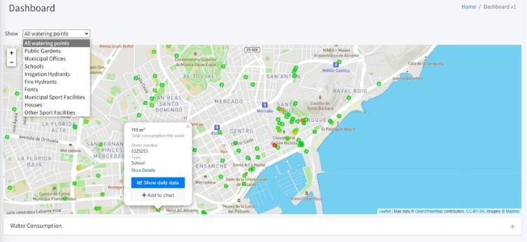 Y, por último, un Cuadro de Control de Consumos Municipales: el alto número de puntos de consumo municipales (zonas verdes, oficinas, colegios…) complica el seguimiento necesario para hacer un uso más eficiente del agua, detectar fugas internas, etc. El Cuadro de Control desarrollado permite visualizar de forma sencilla todos estos datos, detectando consumos anómalos o excesivos, e integrando información de contexto necesaria, tales como número de usuarios o superficie de zonas verdes.