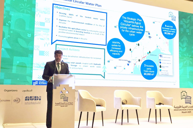 El alcalde de Alicante, Luis Barcala ha intervenido este martes en Riyadh en la jornada de clausura del Foro de Diálogo de Ciudades Árabes y Europeas (AECD 2025) con la presentación de la estrategia municipal ‘Alicante Aguar Circular’ para el máximo aprovechamiento de los recursos hídricos, que está considerada por la organización de la cumbre saudí como “un ejemplo de gobernanza eficaz y exitosa, que ha generado resultados positivos en la mejora de la participación ciudadana y el desarrollo local”. El primer edil ha utilizado el árabe al principio y al final de su intervención, lo que ha cosechado el aplauso de los asistentes a esta sesión de trabajo, así como el inglés y el español en la parte central de su exposición.