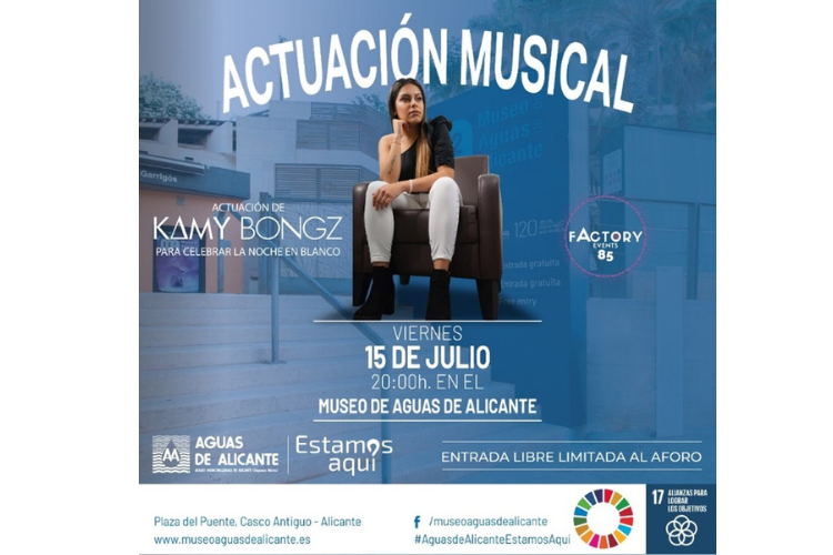 Nuestro Director de Relaciones Institucionales de Aguas de Alicante, Martín Sanz, ha señalado que “en línea con lo que la programación que el Museo de Aguas viene ofreciendo desde hace tiempo, nos sumamos a la celebración de la “Noche en Blanco” con una novedosa propuesta en forma de actuación musical el próximo 15 de julio desde las 20:00 horas, a cargo de Kamy Bongz, cantante, músico y compositora de gran versatilidad artística. Como lo han sido recientemente y otros ámbitos, la exposición “Invierno en Tabarca”, arte sonoro de Aurora Domínguez, o el festival VideoArt 2022, desde Aguas de Alicante apostamos por aunar tradición y vanguardia para conformar una oferta cultural satisfactoria para toda la ciudadanía de Alicante y sus visitantes".
