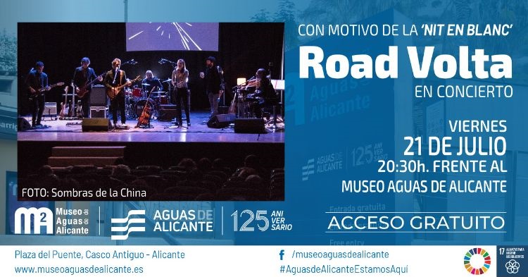 Este año, la propuesta del Museo de Aguas de Alicante consiste en el concierto de "Road Volta", grupo formado a finales de 2014 con músicos procedentes de la escena alicantina de los 90s y que ha compartido escenario con nombres como Loquillo, Los Zigarros, Pistones o Immaculate Fools. El concierto tendrá lugar en la Plaza del Puente, frente a la entrada del Museo de Aguas de Alicante, con acceso gratuito.