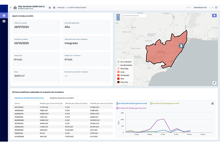 Con el objetivo de proporcionar una herramienta digital de intercambio de datos que integre los resultados obtenidos en cada zona, el Ministerio para la Transición Ecológica y el Reto Demográfico presentó la plataforma COVID-19 City Sentinel de SUEZ España a los representantes de las Consejerías de Sanidad y/o de Agua y Medio Ambiente de las Comunidades Autónomas, en la reunión del Grupo de Trabajo de la Red de Alerta Temprana el pasado 28 de octubre. Así pues, City Sentinel será la herramienta digital que las administraciones públicas tendrán a su disposición para poder visualizar las concentraciones de SAR-CoV-2 en el agua residual en los diferentes puntos de control de sus respectivas comunidades, los mapas de áreas tributarias de cada depuradora, el histórico de mediciones y sus evoluciones. Además, la plataforma agrega información relevante para facilitar la toma de decisiones, ya que unifica y combina los resultados analíticos con los indicadores de evolución sanitaria de la zona y el conocimiento de la red. Esta plataforma es completamente flexible, escalable y accesible desde cualquier dispositivo con acceso a Internet.
