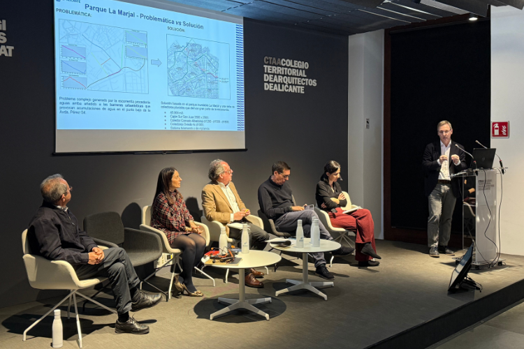Dirigida por Emilio Vicedo, presidente del Colegio Territorial de Arquitectos de Alicante, la jornada titulada “Sistemas de drenaje sostenible: 10 años del Parque La Marjal como referente internacional de solución basada en la naturaleza” ha contado con las intervenciones de Sara Perales, experta en Sistemas Urbanos de Drenaje Sostenible; Leticia Martín, directora general de Planeamiento del Ayuntamiento de Alicante; Manuel Beltrá, arquitecto municipal al cargo de proyecto La Marjal durante su construcción; José Manuel Lázaro, responsable de Oficina Técnica y Planificación en Aguas de Alicante; y Jorge Olcina, Catedrático de Climatología de la Universidad Alicante.