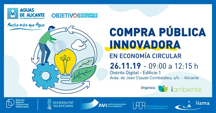 El Distrito Digital de la Comunidad Valenciana acoge el próximo 26 de noviembre de 9:00 a 12:15 horas la presentación de la primera Guía Europea de Compra Pública Innovadora en Economía Circular, desarrollada gracias a la colaboración entre la Agencia Valenciana de la Innovación, Aguas de Alicante, la Universidad de Alicante (a través del IUACA, Instituto Universitario del Agua y de las Ciencias Ambientales) y la Universidad Politécnica de Valencia (a través del IIAMA, Instituto de Ingeniería del Agua y Medio Ambiente).